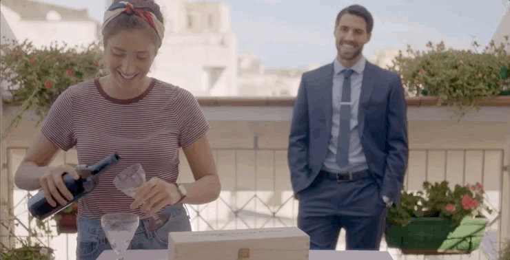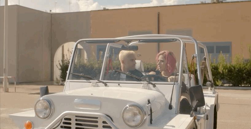 Each couple has a scene in a car - AUTO - in a house - CASA - and on a boat - BARCA.